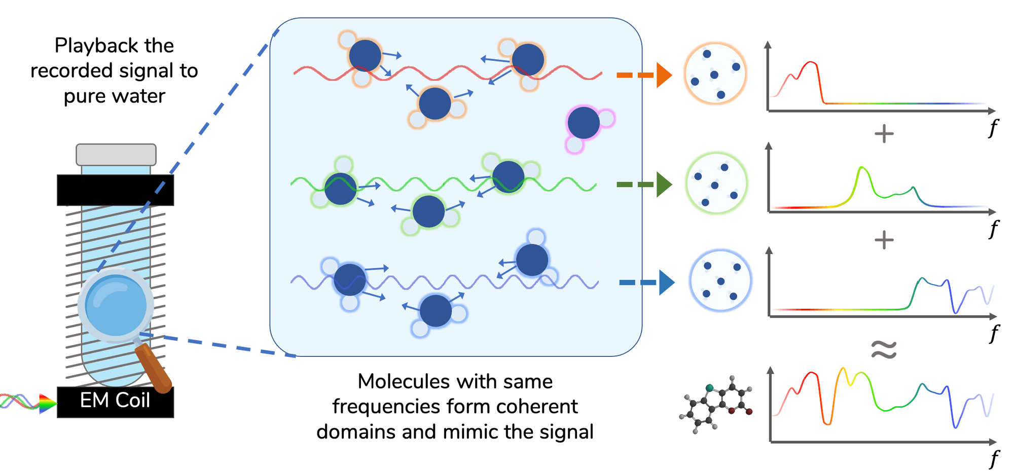 When we playback signal recorded from substance to pure water, the water molecules will organize in coherent domains and mimic the EMF spectrum of the original substance.