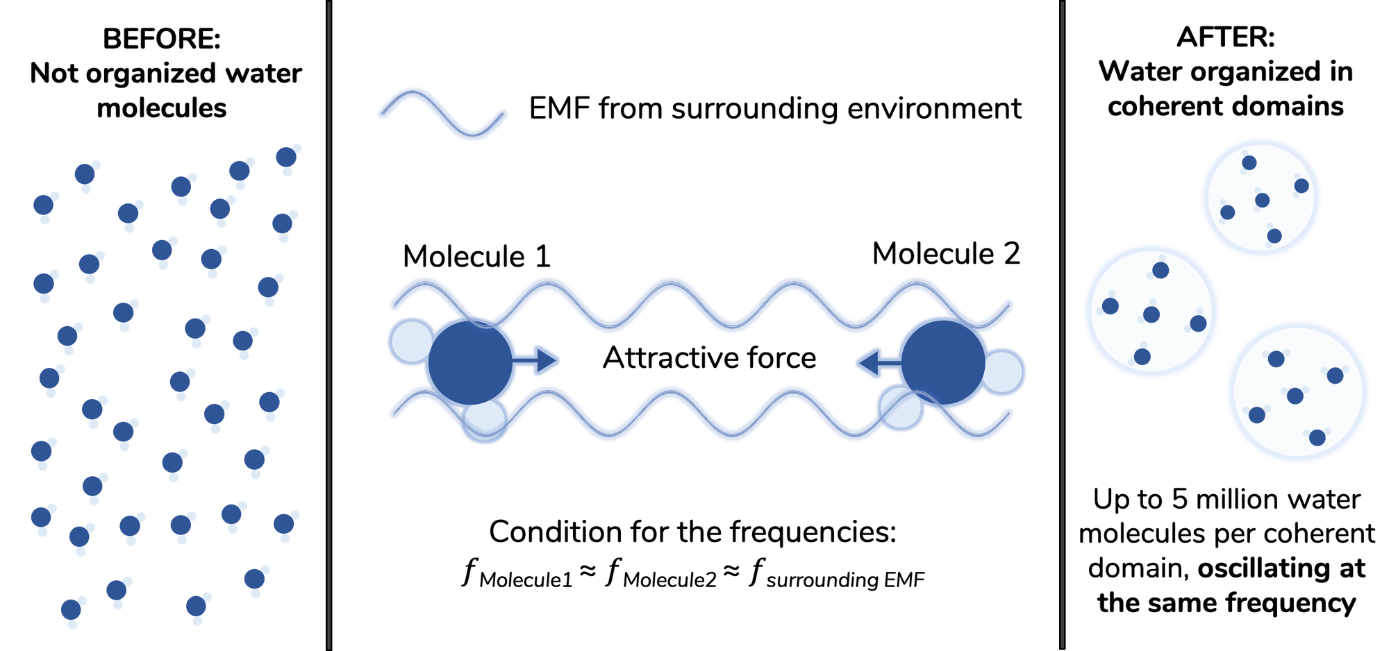 The Quantum Electrodynamic Theory of coherent domains in water was proposed by Italian scientists Emilio Del Giudice and Giuliano Preparatta, which basically states that water molecules under the influence of a surrounding electromagnetic field can form coherent domains. All molecules inside the same coherent domain oscillate at the same frequency.