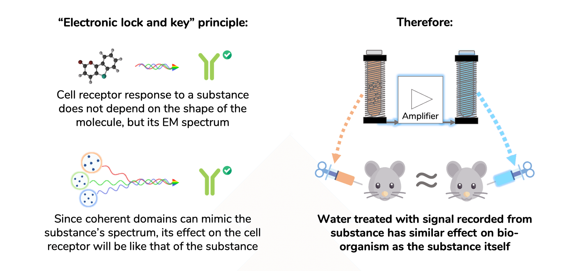 Water with coherent domains that mimic a specific signal can interact with cell receptors in a way that is similar to the lock and key principle – in this case, an electronic lock and key.